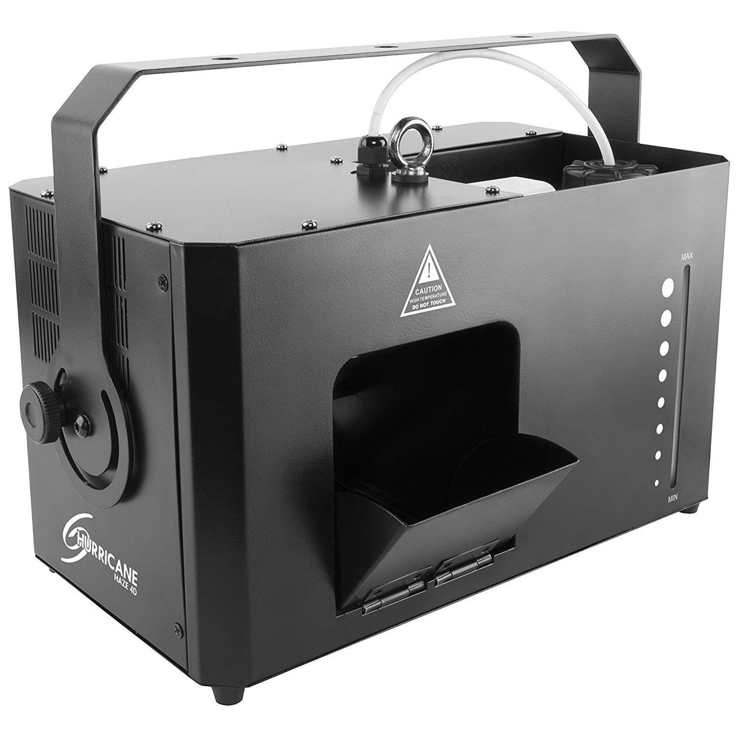 Hurricane Haze 4D is a low profile hazer with an adjustable scoop to direct the haze and a discreet fan. It can be controlled with the included wired timer remote and built-in DMX.