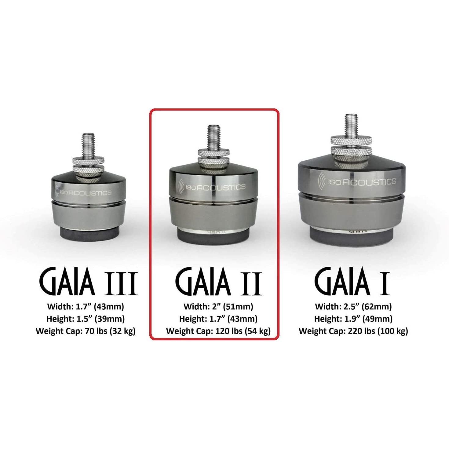 - The GAIA I includes thread adaptors for sizes M8-1.25, M12-1.25 and ¼”-20. Alternative thread size adaptors are available upon request. Contact the amazon seller or IsoAcoustics for alternate thread size adaptors.