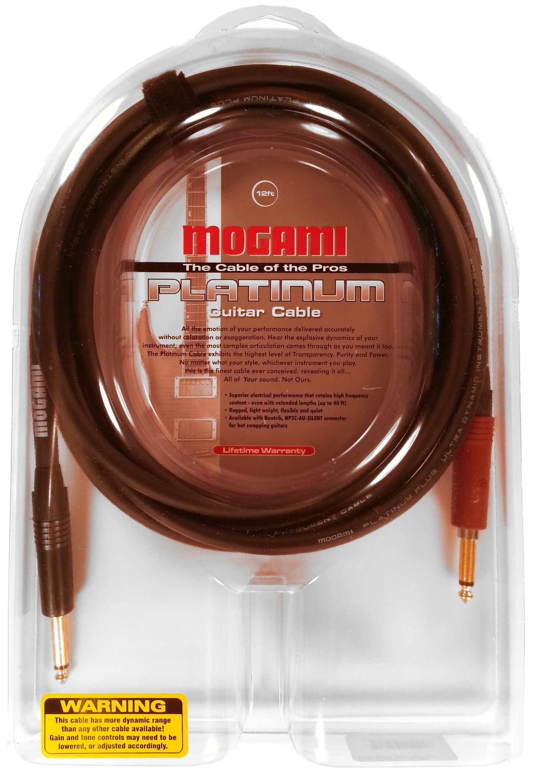 Mogami Platinum GUITAR-12 Instrument Cable, 1/4" TS Male Plugs, Gold Contacts, Straight Connectors with silentPLUG, 12 Foot
