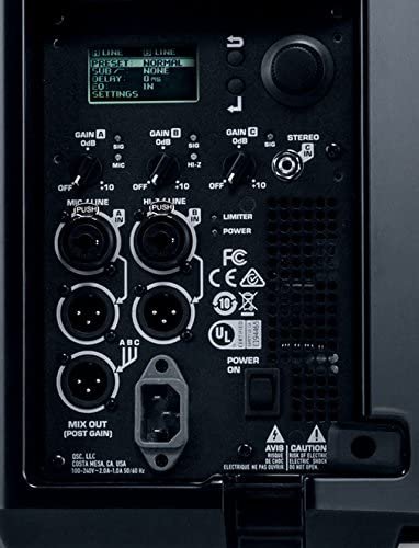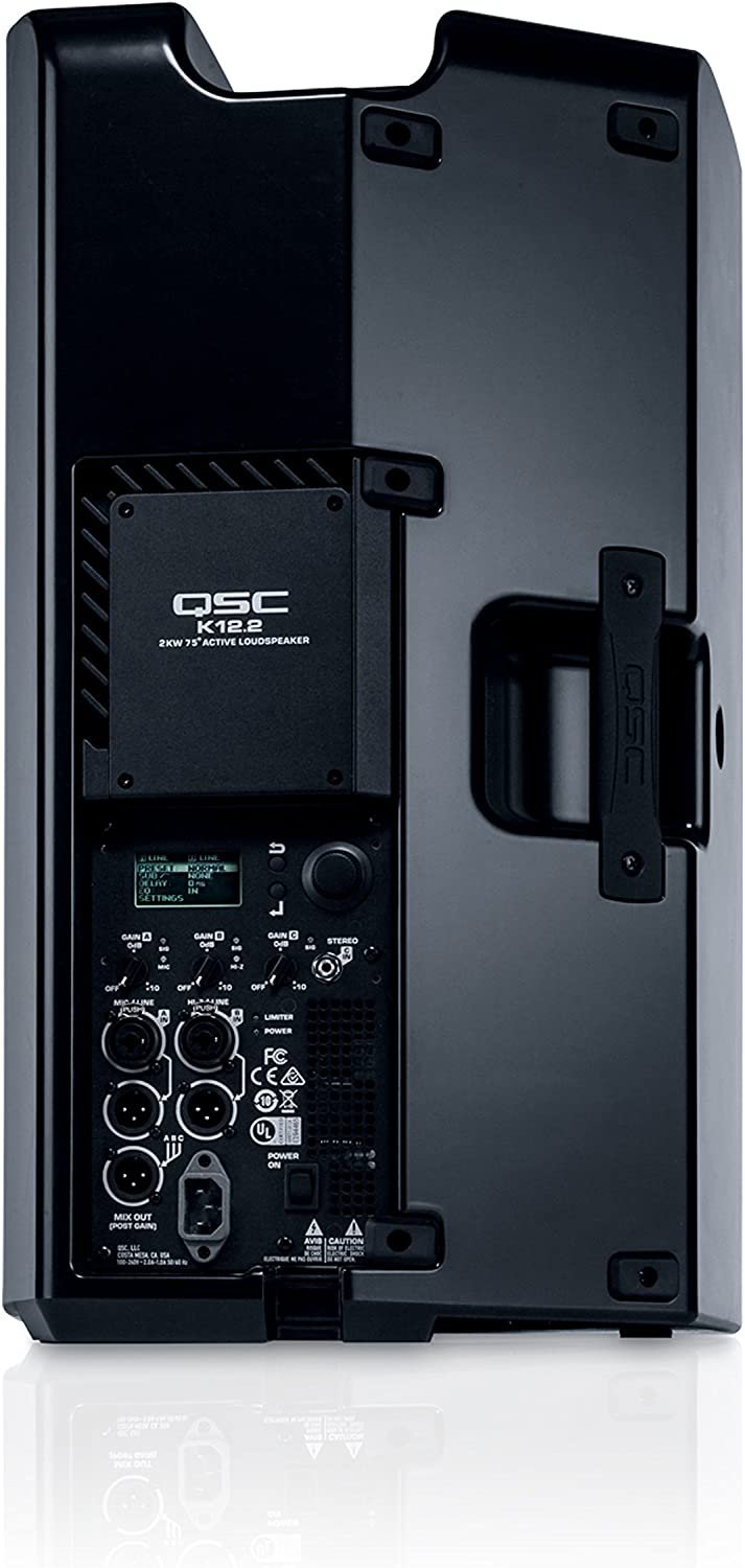 QSC K.2 Series K12.2 2000 Watt Powered 2-Way Portable Loudspeaker. Connect the AC power cord to the IEC socket on the back of the amplifier. Make sure the plug is fully inserted into the IEC socket on the power amplifier module. Dual pole cup mounts (standard and 7.5 degree down-tilt).Frequency Response (-6 dB) : 50 Hz - 20 kHz.