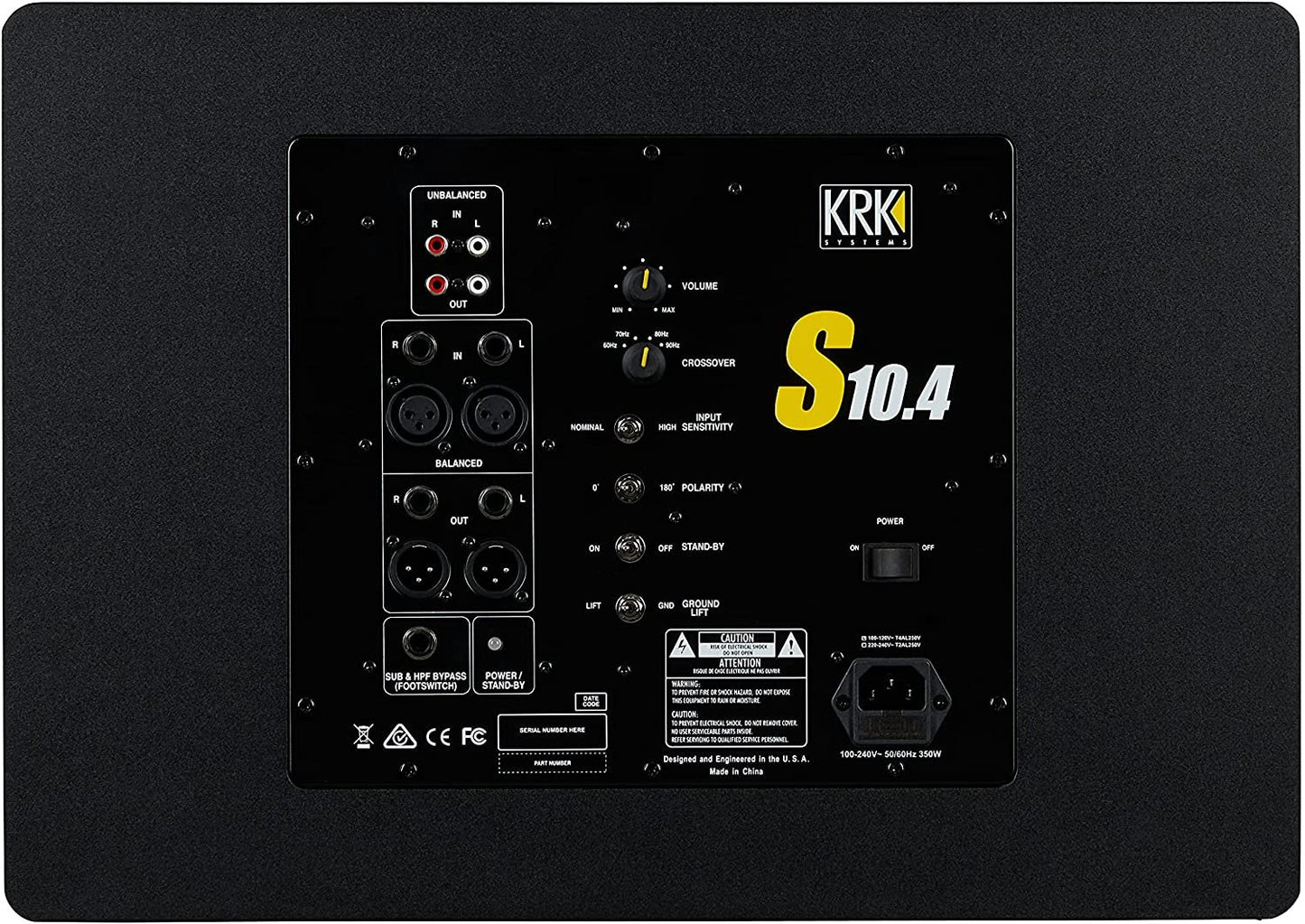 "The S10.4 powered studio subwoofer builds upon KRK’s legacy for sonic accuracy and performance. The custom-voiced, glass-aramid woofer delivers tight, defined bass, while the Class-D power amplifier dramatically increases transient response, control and punch. The four-position selectable crossover makes it easy to adjust the subwoofer setting to your existing monitors. Pairing the S10.4 with KRK or another studio monitors delivers an optimized listening and mixing experience with extended low end, while the exclusive bypass-control feature provides full range audio to the monitors without switching off the subwoofer. KRK's S10.4 subwoofer doesn’t just deliver precise bass and a rich feature set: it’s the next dimension in subwoofer performance."